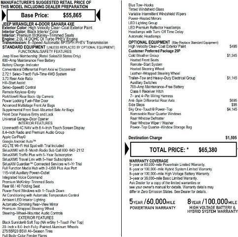 Carfax 1 Owner New Vehicle Trade! Wrangler Sahara 4XE, 2.0 I4, 4WD, 8 Speed Automatic, SKY ONE TOUCH ROOF, Heated Front Seats, Heated Steering Wheel, Trailer Tow Package, Remote Start, Automatic Climate Control, Rear View Camera, Uconnect NAV, Sirius XM Radio, Remote Keyless Entry, Power Windows, Power Locks, Power Mirrors. This vehicle has good tires, is in good condition and is ready for many more miles! This Wrangler Sahara has a clean vehicle history report and does not have any accidents. Call us today, this vehicle won't last long at this price 573-677-1305! Laura Automotive Group, serving our communities for over 43 years!! We are a family owned dealership committed to providing our customers the best deals backed by outstanding service!